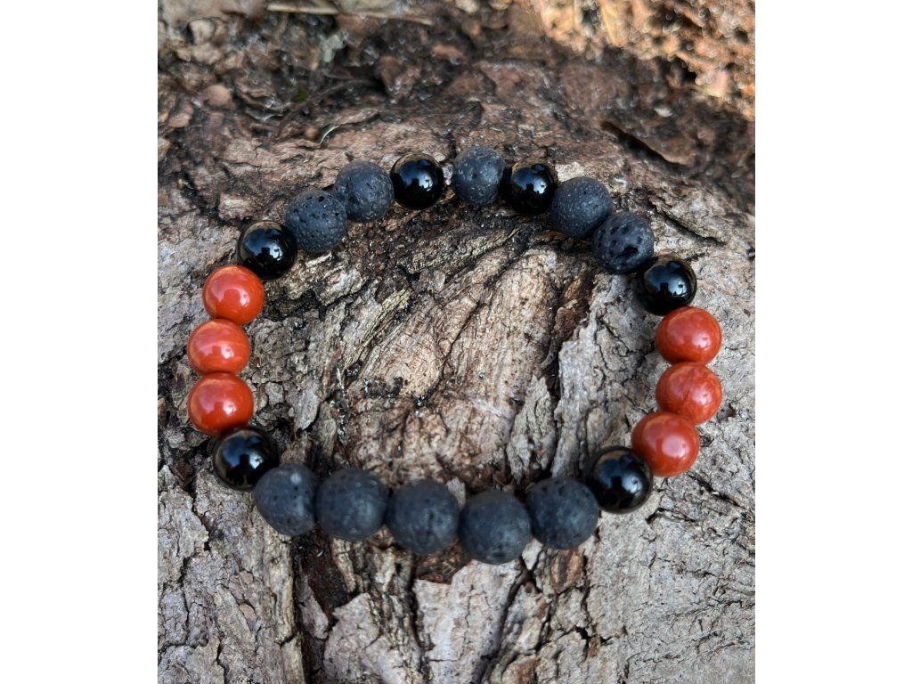 Láva, Onyx a červený Jaspis - propojení černé a červené pro pocit hranic, síly a hlavně bezpečí. Vždy je se o co opřít. Máme tu potřebnou moc.