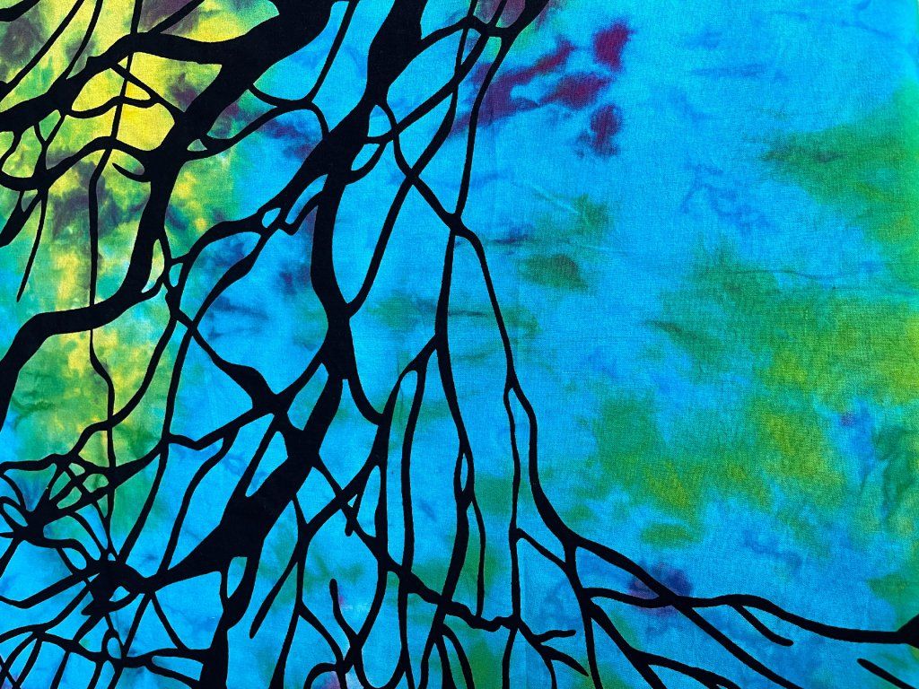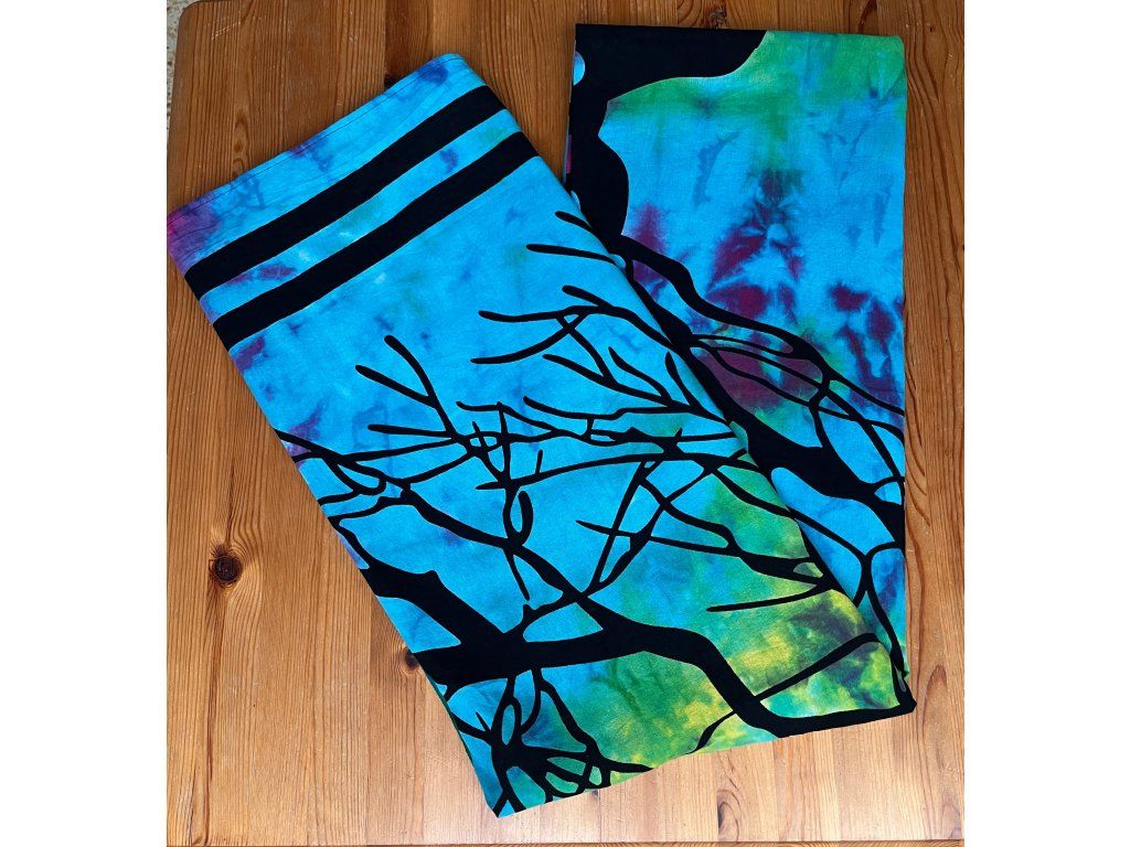 Propojení na batikovaném pozadí vytváří pocit rovnováhy, harmonie a bezprostřední přítomnosti.