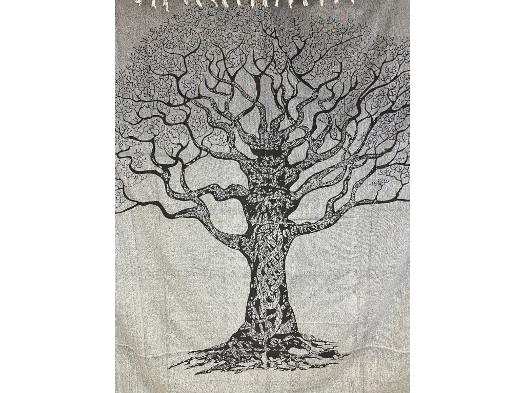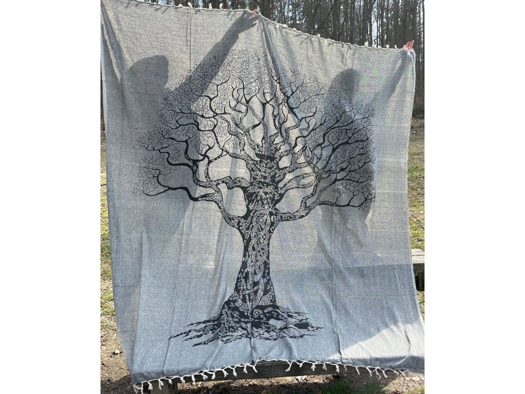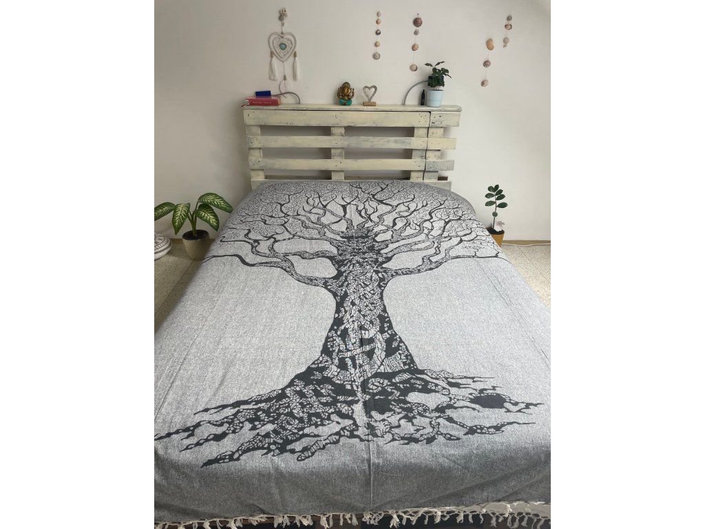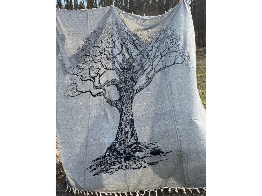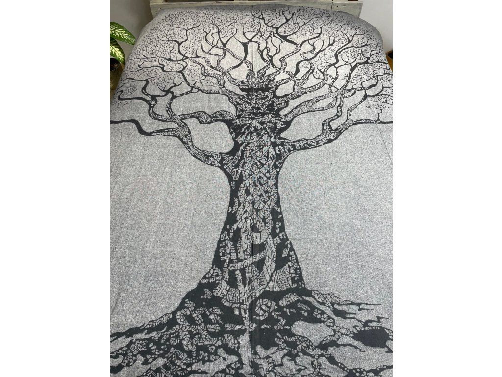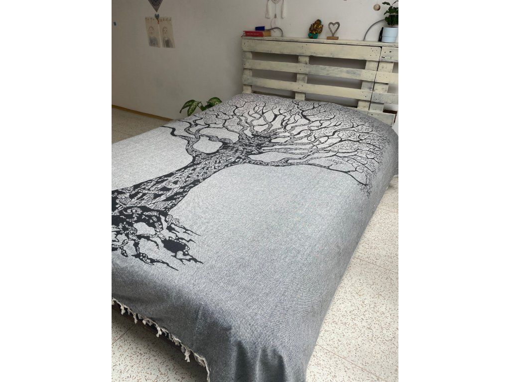 Strom na šedé dece. Decentní a méně výrazná slabší deka/přehoz. Neurazí žádný prostor a snese mnoho využití. Hodí se snad všude právě díky svojí neutrální barvě a jednoduchému motivu stromu.