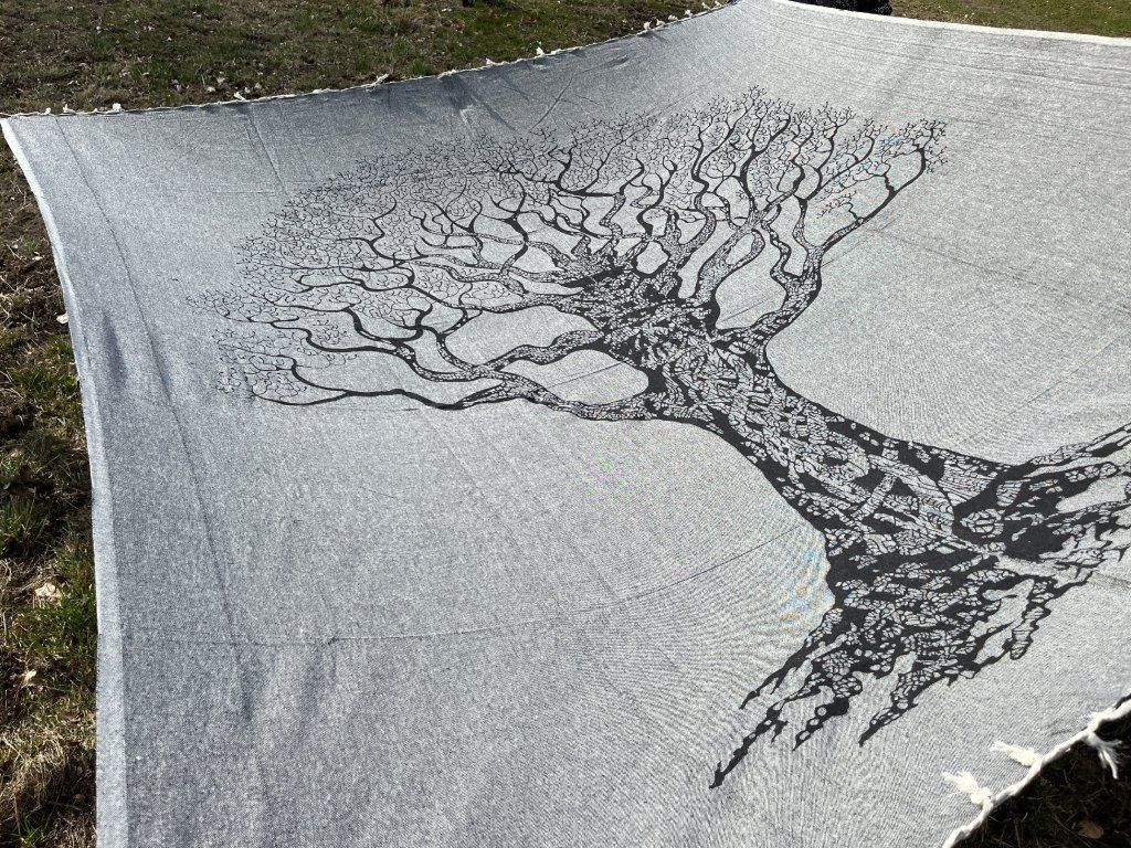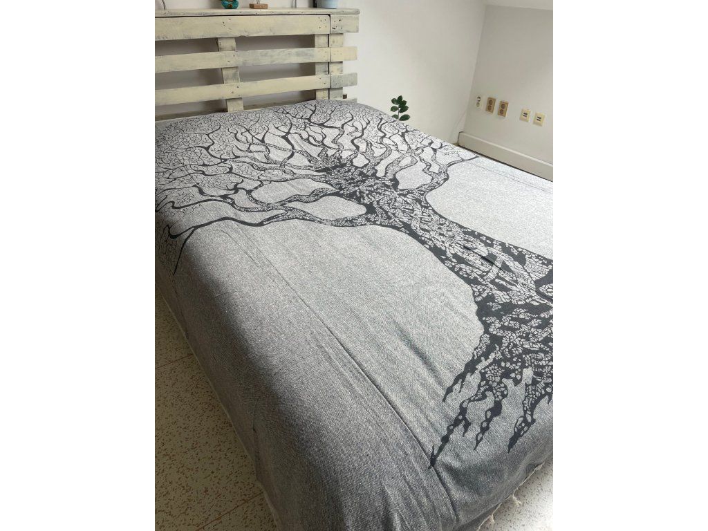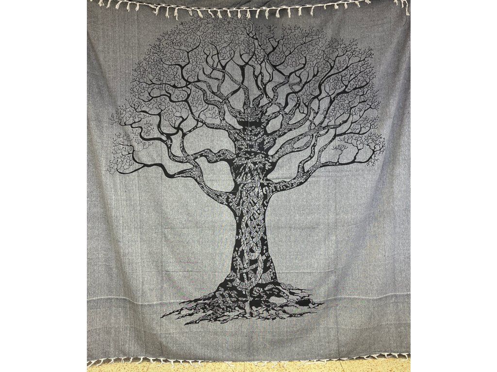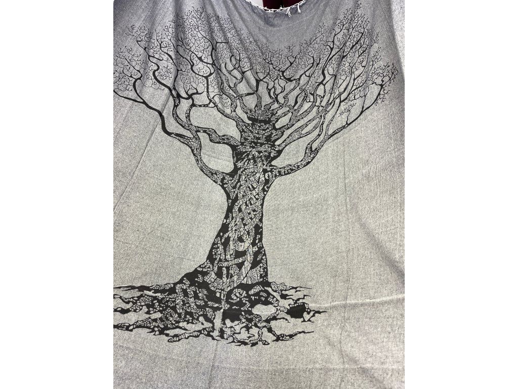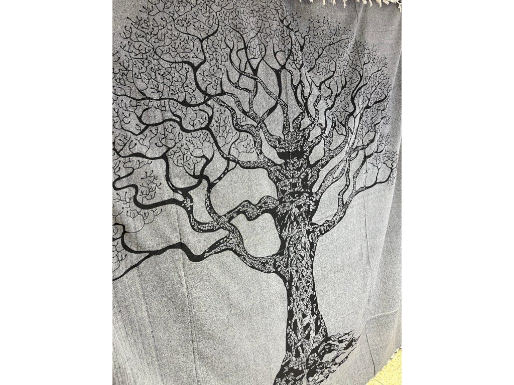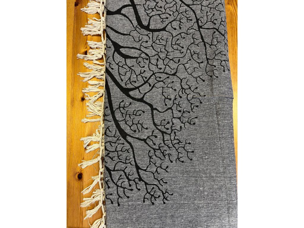 Strom na šedé dece. Decentní a méně výrazná slabší deka/přehoz. Neurazí žádný prostor a snese mnoho využití. Hodí se snad všude právě díky svojí neutrální barvě a jednoduchému motivu stromu.
