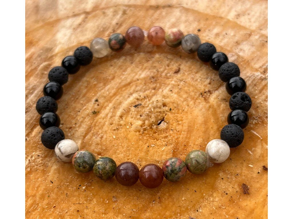 Zemitý, s nadhledem, a přesahem. Černý Onyx a Láva doplněné o Živec, Unakit a hnědý Avanturín.